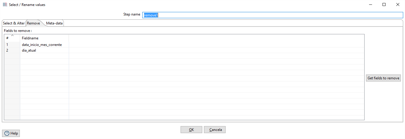 Agora para cada fluxo vamos remover os campos que não precisamos mais. Para isso utilizaremos o “select values” na aba de “remove”. Configurem conforme abaixo para cada fluxo: